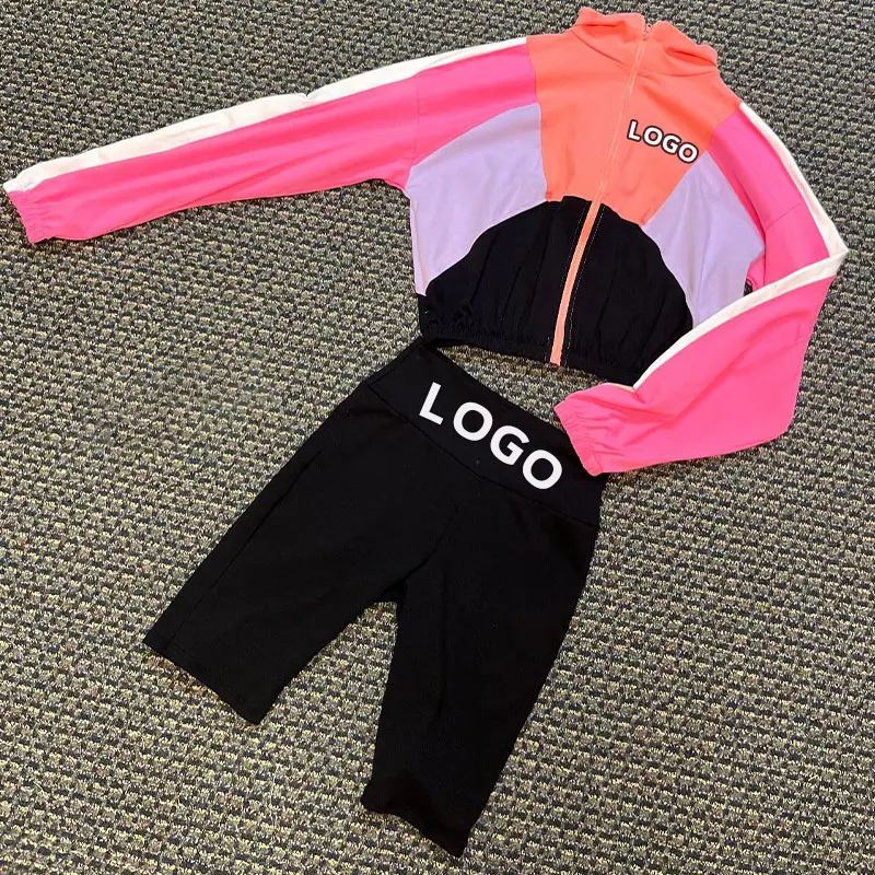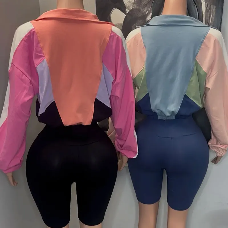 Huili Manufacturer Custom logo High Quality Color Block Zip up Crop Top Legging Shorts Sports 2 Piece Activewear Sets for Women